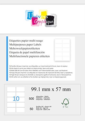 UniversGraphique, 500 Etichette Adesive su Fogli A4, Colore Bianco, 99.1 x 57 mm, Fogli 50, 10 Etichette per Foglio, Ref UGE10