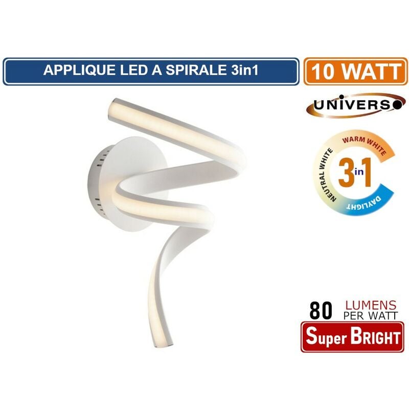 Applique LED Universo mod. AQ19-3C con potenza di 10W . Forma a spirale in metallo + acrilico disponibile con finitura bianca. Fascio luminoso di 270°, flusso luminoso di 800 lm e rapporto di 80 lm/W. Questa lampada è dimmerabile, quindi compatibile con sistemi che consentono la regolazione dell'intensità luminosa delle lampade. Incluso driver integrato nel lampadario. La particolarità di questa plafoniera è quella di incorporare diverse temperature colore da scegliere mediante selettore la temperatura colore desiderata: • Luce Bianca Calda (3000K) • Luce Bianca Naturale (4000K) • Luce Bianca Fredda (6500K) Modalità di selezione e memorizzazione temperatura colore Dopo aver accesi l'interruttore selezionare la temperatura del colore desiderata (3000K, 4000K, 6500K). Una volta selezionata la temperatura colore, la stessa verrà memorizzata solo dopo aver spento l'interruttore per 10 secondi circ. A questo punto la temperatura colore selezionata resterà la stessa per ogni accensione