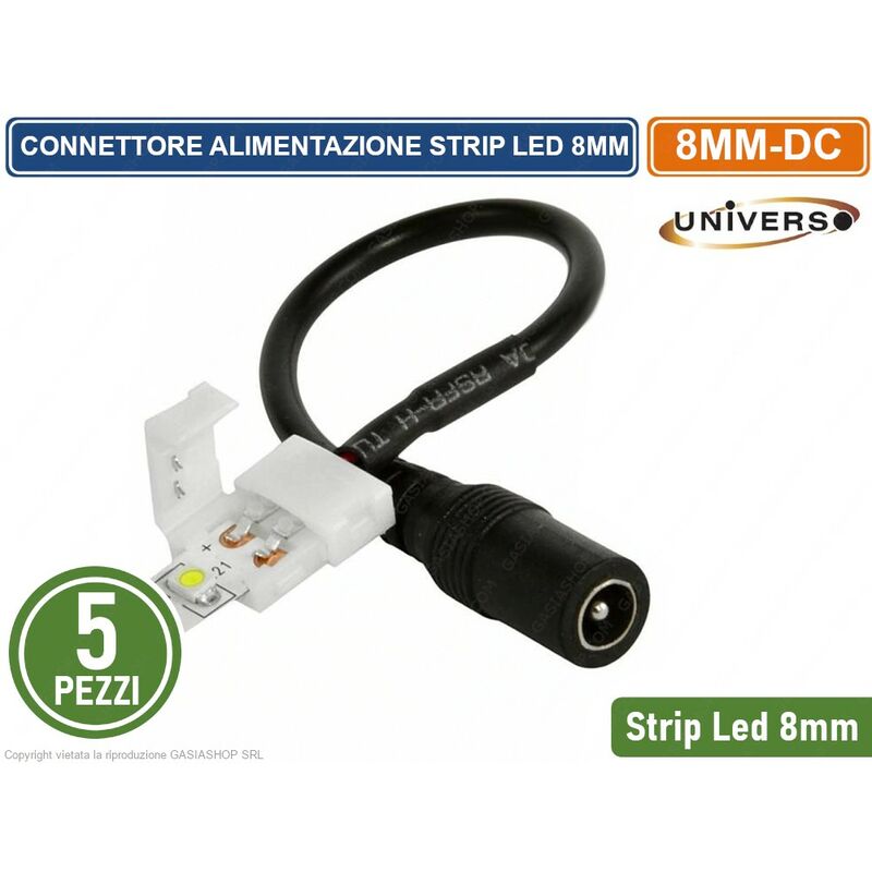 Connettore di alimentazione a innesto rapido per strisce LED Monocolore 8mm. Tramite questo connettore da Clip 2 Pin a Jack 2.1 è possibile connettere la striscia LED all'alimentatore Plug&Play. Basterà tagliare la striscia LED della lunghezza desiderata e fissarla al connettore tramite la clip, senza bisogno di collegamenti o saldature. Lunghezza del cavo 105mm.