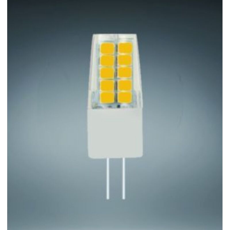 Lampadina Led G4 12V DC/AC 3w Luce Fredda 6500k 280 Lumen G4-08F Lampadina con tecnologia LED SMD, forma bulb in materiale termoplastico con copertura trasparente. Fascio luminoso di 300°, flusso luminoso di 280 lm e un rapporto di 88 lm/W. Alimentazione AC/DC 12V Questo modello di lampadina è disponibile con 3 diverse temperature colore: Luce Bianca Calda 3000K, Bianca Naturale 4000K e Bianca Fredda 6500K Dimensioni: 37 x 10 mm.