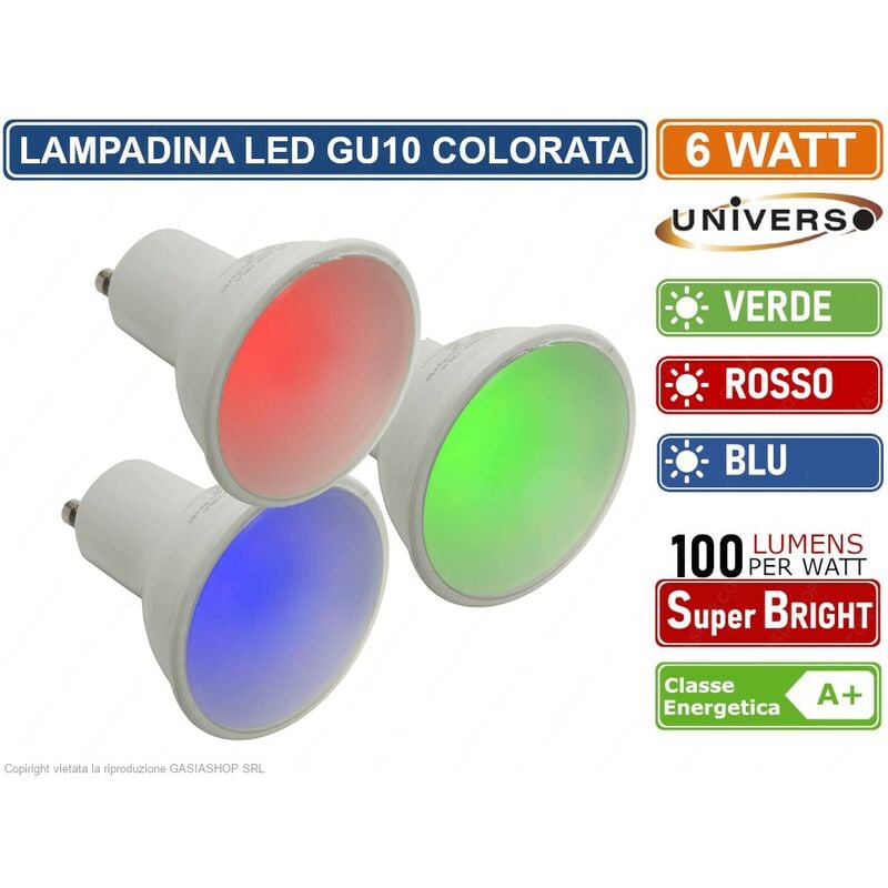 Lampadina LED con potenza di 6W e attacco GU10. Lampadina con tecnologia LED SMD, forma spotlight in materiale termoplastico e copertura opaca. Fascio luminoso di 110°, flusso luminoso di 600 lm e un rapporto di 100 lm/W. La potenza di 6W è equivalente a 54W di una lampadina a incandescenza. Questo modello di lampadina è disponibile con 3 diverse temperature colore: Luce Rossa (GU10-03R), Verde (GU10-03V) e Blu (GU10-03B). Questo prodotto ha una garanzia di 5 anni. Dimensioni: Ø 49 x 58 mm.