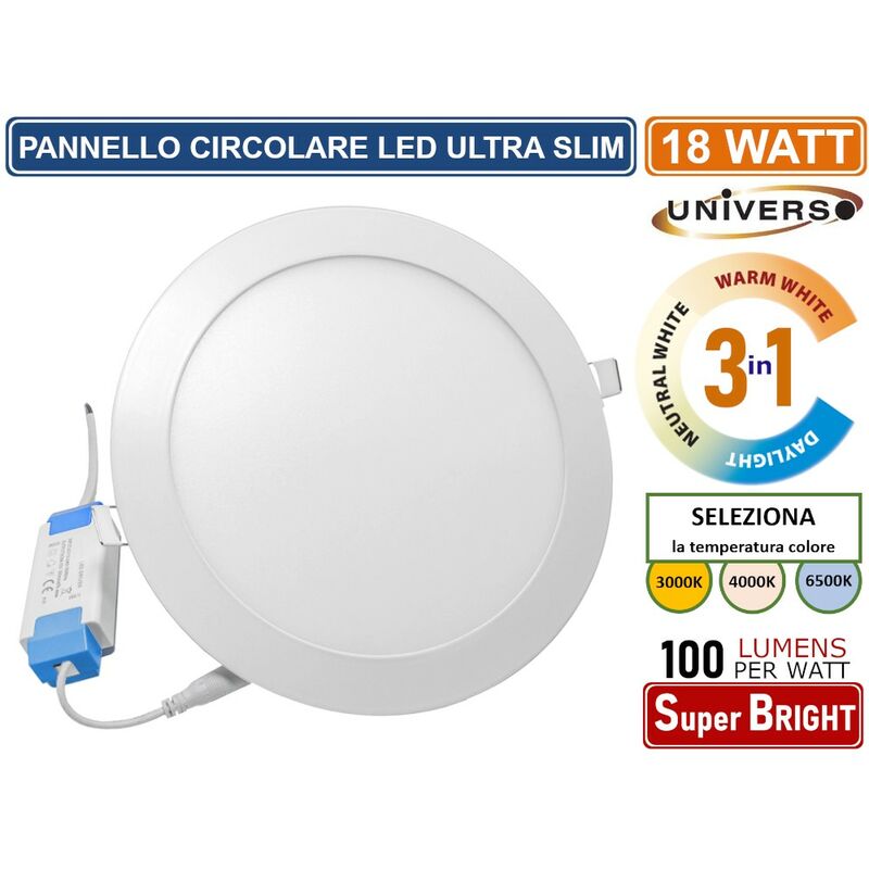 Universo P205A-T3C è un mini pannello LED rotondo con potenza di 18W, ideale per un'installazione ad incasso . Con fascio luminoso di 120° e flusso luminoso di 1800 lm, questo pannello ha un rapporto di 100 lm/W . Realizzato in alluminio di colore bianco, ha una copertura a finitura opaca in PMMA che garantisce sempre una luce costante nel tempo, sia a livello cromatico che di intensità. Il pannello è dotato di un driver con temperatura colore sezionabile, pronto all'uso che garantisce bassi consumi, lunga durata ed elevata affidabilità. La particolarità di questa plafoniera è quella di incorporare diverse temperature colore da scegliere mediante jack di collegamento tra led driver e pannello: • Luce Bianca Calda (3000K) • Luce Bianca Naturale (4000K) • Luce Bianca Fredda (6500K) Dimensioni: Ø 225 x 10 mm. Dimensione foro incasso: Ø 205mm.