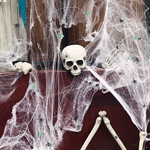 Unomor Glowing Halloween Ragnatela Decorazione con 65 Ragni Finti per Decorazioni di Halloween, per Interni ed Esterni, Glowing Halloween Spider Web