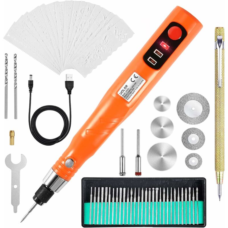 Il kit di strumenti rotanti fai-da-te include tutti i tipi di accessori, che possono essere ampiamente utilizzati per incidere, intagliare, levigare, lucidare, incidere, fresare, levigare, forare, ecc. L'uso senza fili durerà fino a a 3-4 ore al minimo dopo una carica completa. Facile aiutarti a finire un lavoro inciso meglio. La penna per incisione cordless Uolor è dotata di un motore eccellente, potenza fino a 30 W durante il lavoro. 3 posizioni regolano la velocità di rotazione da 5000 a 25000 giri/min per applicare diverse situazioni. 4 modelli base di lettere/numeri aiutano a incidere parole e numeri. Scrivi messaggi personali su gioielli o pietre o usali per incidere arti e mestieri personalizzati. 4 stencil grafici, 8 fiori e 8 adorabili animali ti offrono più modi per personalizzare i tuoi oggetti di valore. Il design leggero e compatto a forma di penna offre un uso confortevole per prestazioni di incisione di precisione, dalle linee sottili alle scanalature profonde.