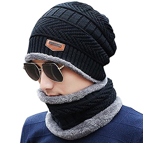 Uomo Berretto in Maglia per Inverno Caldo Cappello Beanie con Sciarpa Autunno (Black)