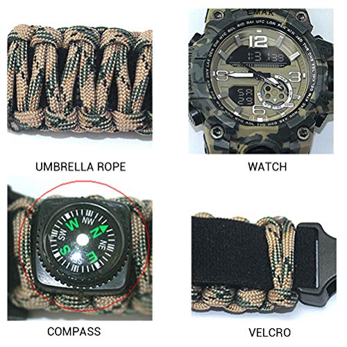 Uomo Donna Sopravvivenza Orologio digitale analogico Sopravvivenza Orologio da polso Sopravvivenza Orologio impermeabile Ombrello Corda Orologio adatto per Escursionismo Campeggio Sopravvivenza (A)