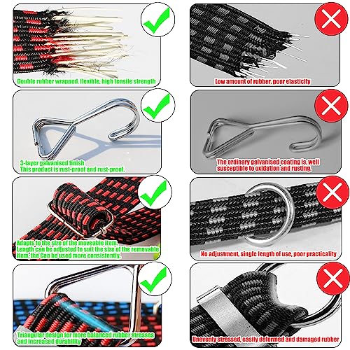 Ganci robusti e antiruggine: i ganci in metallo cromato a doppio strato non si rompono o arrugginiscono e adottano un design triangolare con gancio ad anello per una maggiore forza uniforme. Il nodo di estremità della corda elastica fissato con fibbia in lega di alluminio resistente. Utilizzare con un camion a mano per fissare facilmente gli oggetti e impedire loro di cadere.