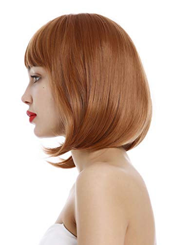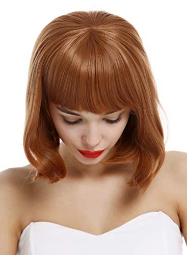 Corta parrucca da donna in un luminoso biondo rossiccio- i capelli biondo ramato hanno una sfumatura biondo oro. Un classico bob lungo con un'ampia frangetta. I capelli lisci hanno punte ricurve.