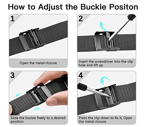Misura regolabile: i cinturini Apple Watch per polso da 6,3 pollici - 9 pollici (160mm-230mm). La lunghezza della fascia del cinturino è regolabile regolando la fibbia in metallo con il cacciavite allegato.(Nota: dopo che il cinturino è stato regolato alla lunghezza appropriata per la prima volta, non è necessario regolarlo in futuro perché la posizione della fibbia è già fissa, tranne che la lunghezza deve essere nuovamente aggiustato.)