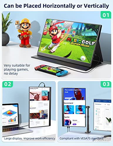 Custodia per monitor e compatibile con VESA: la custodia protettiva del monitor portatile da 17,3 pollici è realizzata in materiale antiscivolo per evitare polvere e graffi. Si può anche piegare e utilizzare come supporto. Passa in diverse angolazioni a seconda delle tue abitudini. I fori per le viti standard VESA 75 sul retro consentono di montare il monitor su un supporto a parete o su un braccio per un posizionamento ottimale in spazi ristretti.