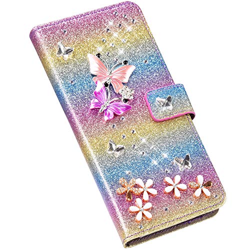 Uposao Compatibile con Samsung Galaxy A41 Custodia Protettiva in Pelle Glitter Bling Strass Diamante Farfalla Fiore Flip Portafoglio Case in Pu Cuoio Cellulare Pieghevole Cover, Arcobaleno