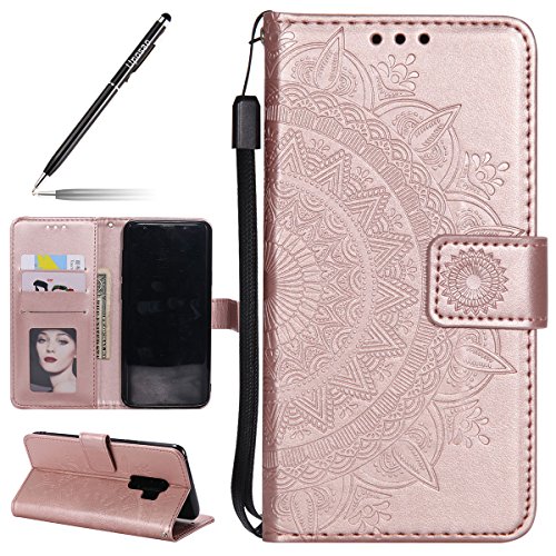 Uposao Custodia per Galaxy S9 Plus Portafoglio,Galaxy S9 Plus Custodia in Pelle, Protettiva Caso con Fiore Modello PU Pelle Custodia Magnetico Flip Case per Samsung Galaxy S9 Plus-(Oro rosa)