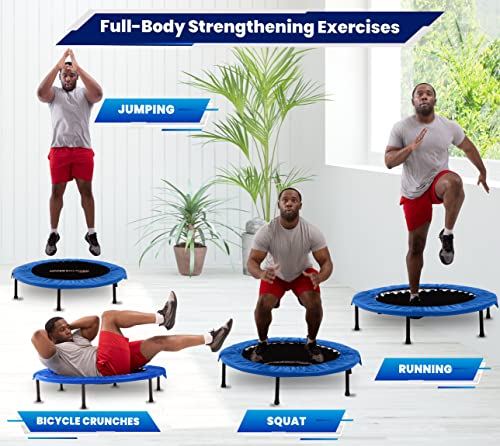 QUALITÀ: Mini tappeto elastico realizzato con un telaio in acciaio zincato resistente di alta qualità e verniciato a polvere per una durabilità e resistenza alla ruggine. Il telo da salto è realizzato in maglia di polipropilene di alta qualità con cuciture a 8 file per fornire un eccellente rimbalzo e prevenire l'usura del tappetino da ginnastica.