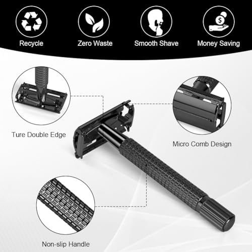 URAQT Doppia Lama Rasoio, Rasoio di Sicurezza Safety Razor con 10 Lamette, Rasoio Sicurezza Idea Regalo Uomo per Cura della Barba(Nero)