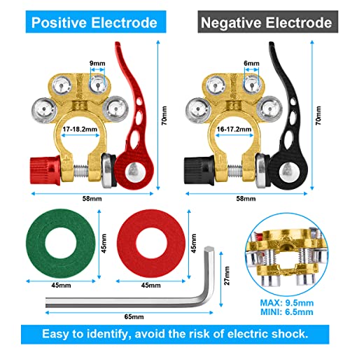【Dimensioni】: Terminali batteria in ottone per diametro filo 5,2 - 7,4 mm (dimensioni AWG 1 - 4) o sezione trasversale 16 - 35 mm. Dimensione minima del filo: 5/8" (16 mm). Clip massima: 0,37"/9,5 mm, Mini clip: 0,25"/6,5 mm.