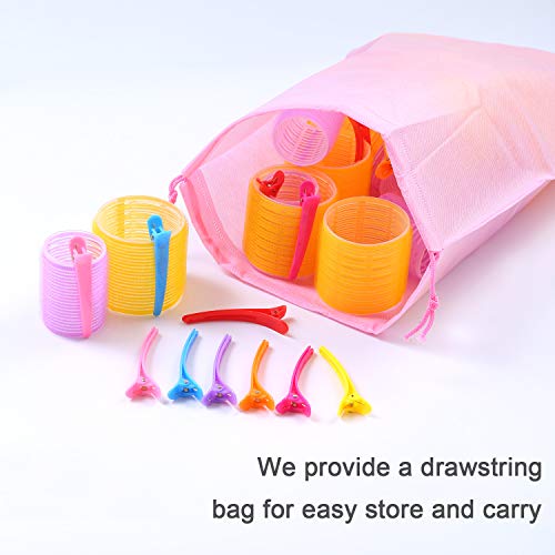 Riceverai 24 rulli autogrip di 2 dimensioni, 64 mm e 44 mm, 12 pezzi per ciascuno, 20 clip per banconote d'anatra, 2 pettini a coda di ratto e 1 borsa con coulisse per tenere questi articoli all'interno.
