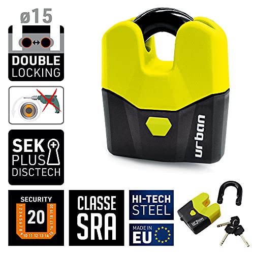 Lucchetto URBAN U8K con un robusto grillo di bloccaggio di 15 mm di diametro. Cilindro di ultima generazione SEK PLUS DISCTECH, un innovativo sistema di doppia chiusura che blocca la forcella alle sue due estremità, raddoppiandone la resistenza a possibili attacchi. Ha un coperchio sulla serratura per proteggerla dall'umidità e dallo sporco.