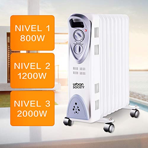 Urban society Radiatore ad olio a 9 elementi, termostato regolabile, 3 livelli di potenza, sistema anti-urto, 2000 W