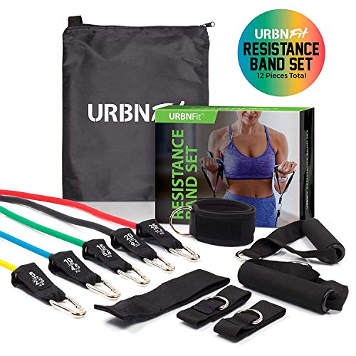 URBNFit Set Fasce Elastiche Di Resistenza (12 Pezzi) Inclusi Ancoraggio Porta, Cinturini Caviglie & Polsi, Libretto Esercizi E Borsa Per Il Trasporto Per Rinforzare E Allenarsi (Pro Series)