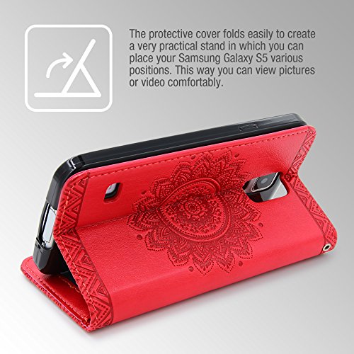 Urcover Lotus Pattern Case Wallet | Custodia Samsung Galaxy S5 | Flip Cover Ecopelle in Rosso | Bumper Protettiva Portafoglio Slot Card Trend Elegante Tribal Mandala Acchiappasogni