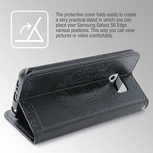 Urcover Lotus Pattern Case Wallet | Custodia Samsung Galaxy S6 Edge | Flip Cover Ecopelle in Nero | Bumper Protettiva Portafoglio Slot Card Trend Elegante Tribal Mandala Acchiappasogni