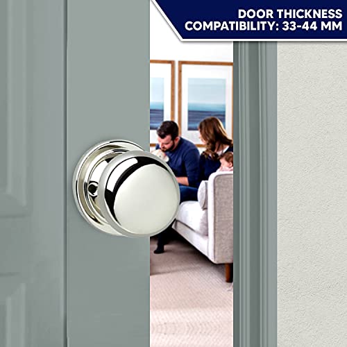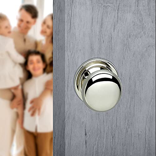 Dimensioni e finitura: il pomello a mortasa in nichel lucido della collezione Modern ha una piastra di fissaggio del diametro di 64 mm e una manopola di diametro di 52 mm. Richiede un fermo tubolare, serratura a mortasa standard o serratura a mortasa standard del bagno e bocchetta.