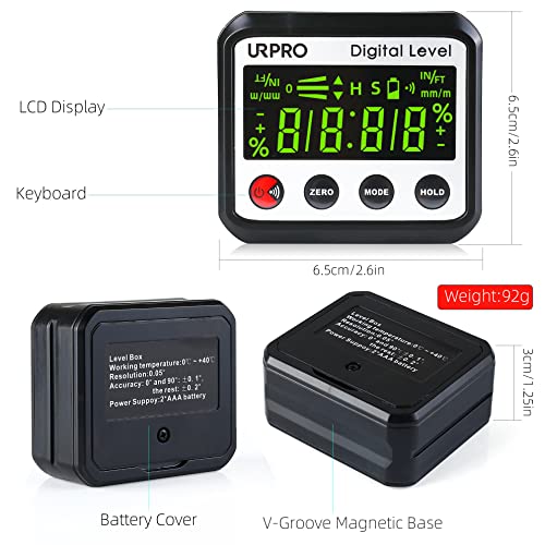URPRO Scatola di livello digitale Calibro angolare Goniometro Inclinometro Scatola smussata con base magnetica, ampio bolla orizzontale per edilizia Falegname Artigiano Casa