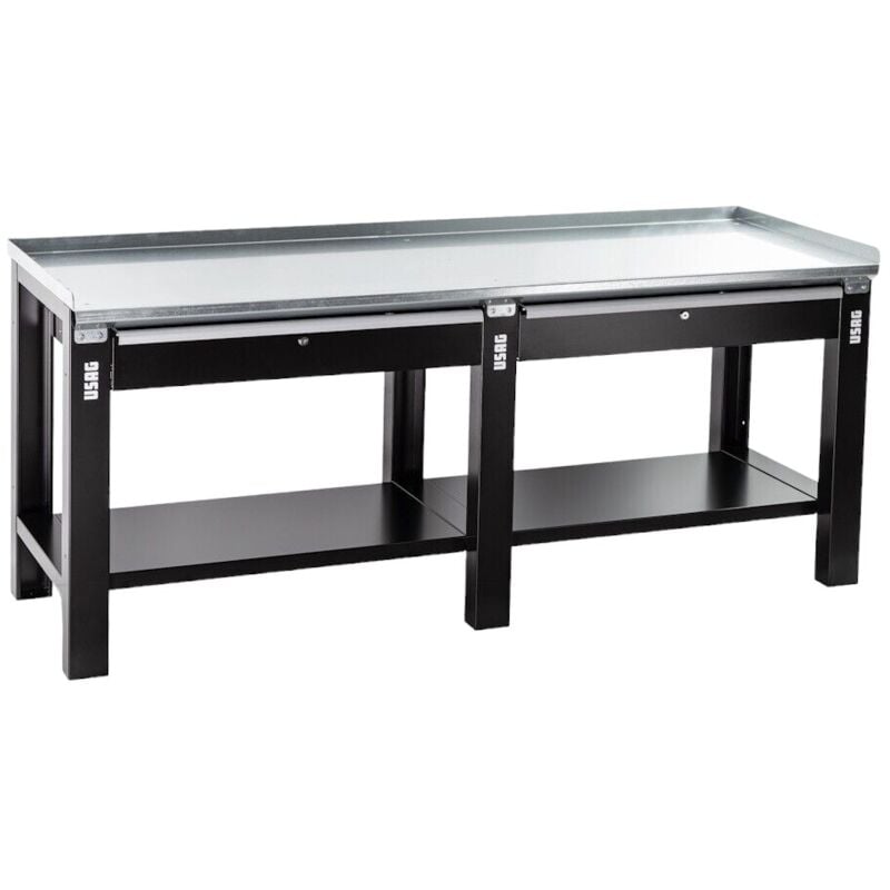 Usag 506 TAC Banco da lavoro con piano in acciaio e 2 cassetti Descrizione • Inclusi 2 cassetti con dimensioni interne 834x550x130 mm • Cassetti montati su guide telescopiche con portata massima 60 Kg • Piano di lavoro in lamiera d'acciaio spessore 3 mm • Bordi anticaduta con altezza 37 mm su 3 lati • Montanti e ripiano inferiore in lamiera d'acciaio spessore 1,2 mm • Struttura verniciata colore nero RAL 9005 • Fori laterali per il fissaggio di più banchi affiancati • Predisposizione per il fissaggio a pavimento • 6 montanti per il modello di lunghezza 2 metri • Possibilità di montare il cassetto 506 TC1 • Portata statica: 2000 Kg • Spazio tra due montanti: 864 mm Dimensioni e Peso • A: 200 cm • B: 86 cm • C: 70 cm • D: 86,4 cm • Peso: 86 Kg