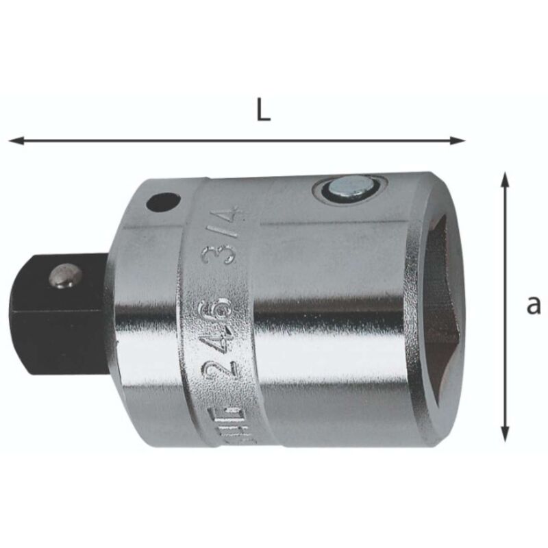 Bussola Riduzione 74mm - Usag 246 1 U02460404 ISO 3316 Torsione massima ammissibile 1412 Nm Modello con quadro maschio intercambiabile Acciaio speciale altamente legato al Cromo Vanadio Esecuzione cromata Codice Attacco quadro femmina Attacco quadro maschio L mm a mm Q.tà x conf. U02460404 1 3/4 74 42 1