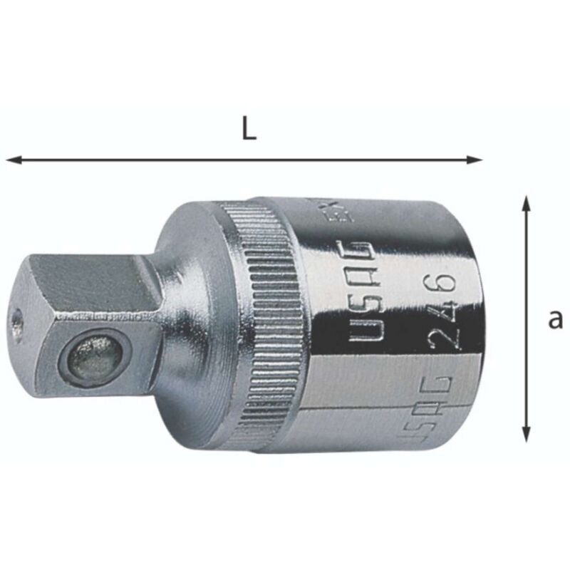 Bussola riduzione 246 3/8' - Usag 246 3/8 U02460001 ISO 3316 Torsione massima ammissibile 62 Nm Acciaio speciale altamente legato al Cromo Molibdeno Esecuzione cromata Codice Attacco quadro femmina Attacco quadro maschio L mm a mm Q.tà x conf. U02460001 3/8 1/4 25 18 5