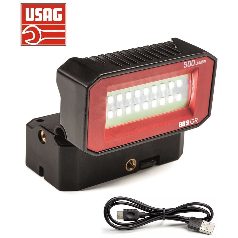 USAG 889 GR FARETTO COMPATTO LUCE A LED SENSORE DI MOVIMENTO RICARICABILE 500 LM DESCRIZIONE Ideale per illuminare ampie zone di lavoro Super compatto Corpo in materiale composito Resistente agli impatti Dotato di sensore di movimento: una volta accesa la lampada, è possibile attivare il sensore premendo il tasto con logo mano. Dopo circa 20 secondi la lampada si spegne, attivandosi nuovamente solo al passaggio o al movimento che si verifica nei pressi dello stesso (fino a 5 metri di distanza) Riflettore fluorescente per individuare il faretto spento in zone molto buie 3 livelli di luminosità selezionabili Struttura rinforzata ad alta resistenza Base magnetica regolabile in più posizioni fino a 90° Gancio regolabile a 360° Possibilità di montaggio sul treppiede Controllo dello stato di carica tramite spia luminosa sulla lampada (rosso: carica in corso, verde: ricarica completata) Fornito con cavo USB-C DATI TECNICI/CARATTERISTICHE Fonte di luce 18 x 0.5W SMD LED N° livelli di