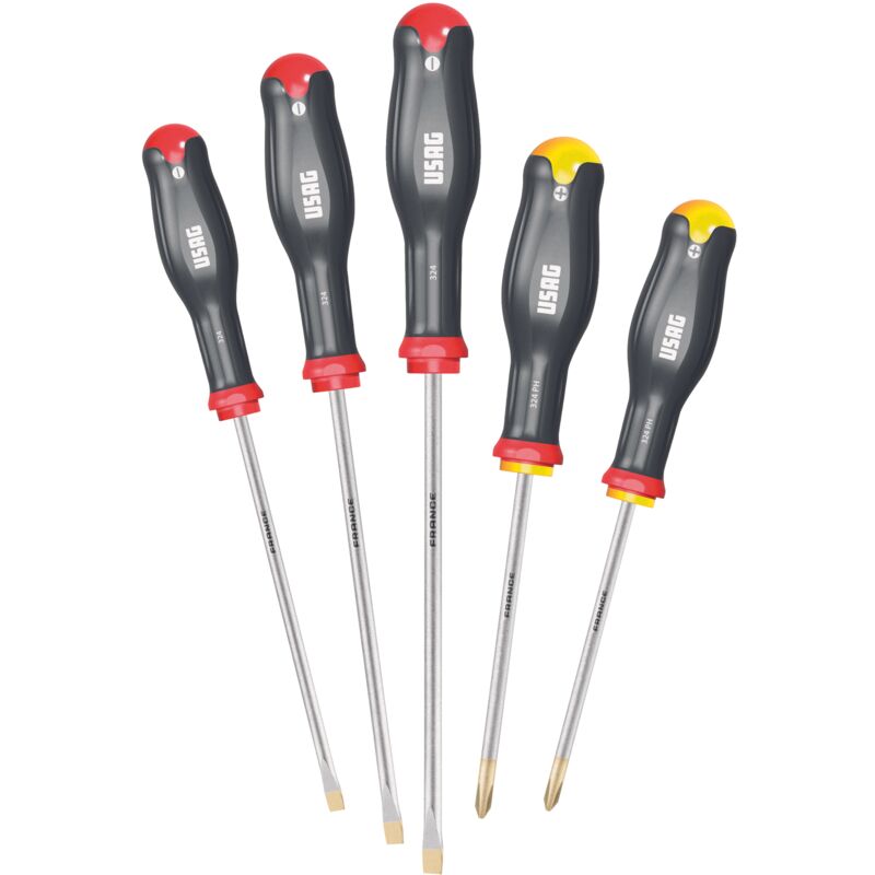 SERIE DI 5 GIRAVITI PER VITI CON INTAGLIO E IMPRONTA A CROCE PHILLIPS® Punta zincata che garantisce un'elevata resistenza all'usura ed alla corrosione Lama in acciaio al Cromo Silicio Vanadio per un'ottima resistenza alla flessione Impugnatura ergonomica trimateriale con rivestimento soft grip, resistente ad olii ed agenti chimici Codice colore sull'impugnatura per distinguere le diverse impronte Codice Peso gr U03240645 440