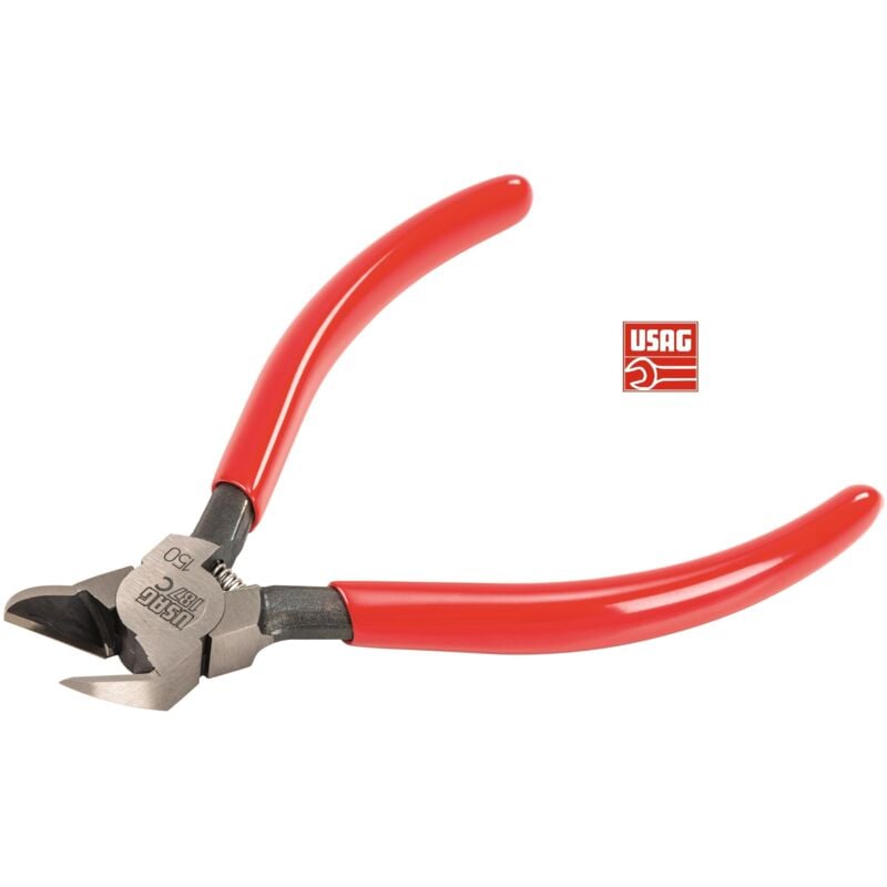 USAG 187 C TRONCHESE PER MATERIALI PLASTICI TAGLIENTE RASO PIEGATO A 45° TRONCHESE A TAGLIENTE RASO DIAGONALE PIEGATO A 45° PER MATERIALI PLASTICI MODELLO USAG 187 C DESCRIZIONE Becchi arrotondati ribassati Molla di richiamo Manici rivestiti con guaina in PVC Corpo in acciaio speciale altamente legato al Cromo Vanadio Esecuzione brunita testa pulita DIMENSIONI L mm - 150 A mm - 18 CODICE - U01870001