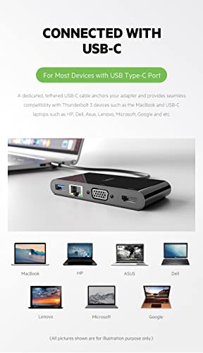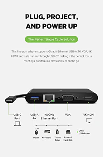 Questo pratico adattatore ti permette di condividere e visualizzare contenuti e di connetterti a Internet tramite le porte VGA, HDMI, USB-A 3.0 e Gigabit Ethernet