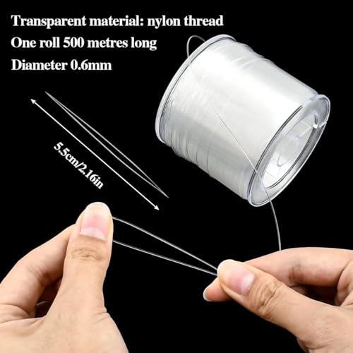 【Set filo nylon versatile】 Il nostro filo trasparente per cucire include una bobina di filo di nylon trasparente di alta qualità con una lunghezza di 500 metri e un diametro di 0,6 millimetri, oltre a un pratico ago infilatore.