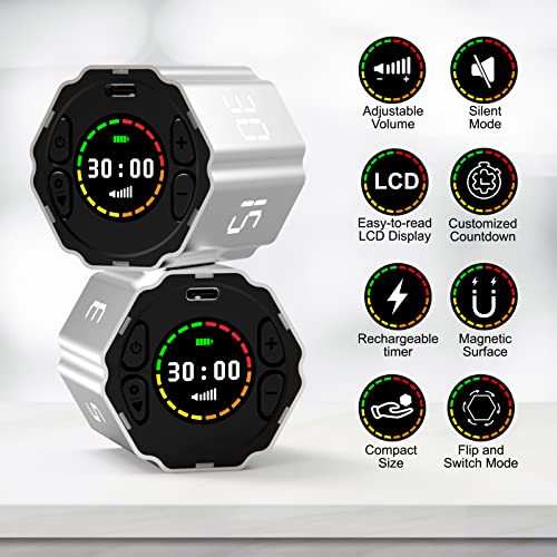 USHINING Ushining Timer digitale a cubo, timer magnetico con funzione muto e allarme audio regolabile, timer per lavoro, cucina, ufficio, studio, 3/5/10/15/30 min, conto alla rovescia, argento