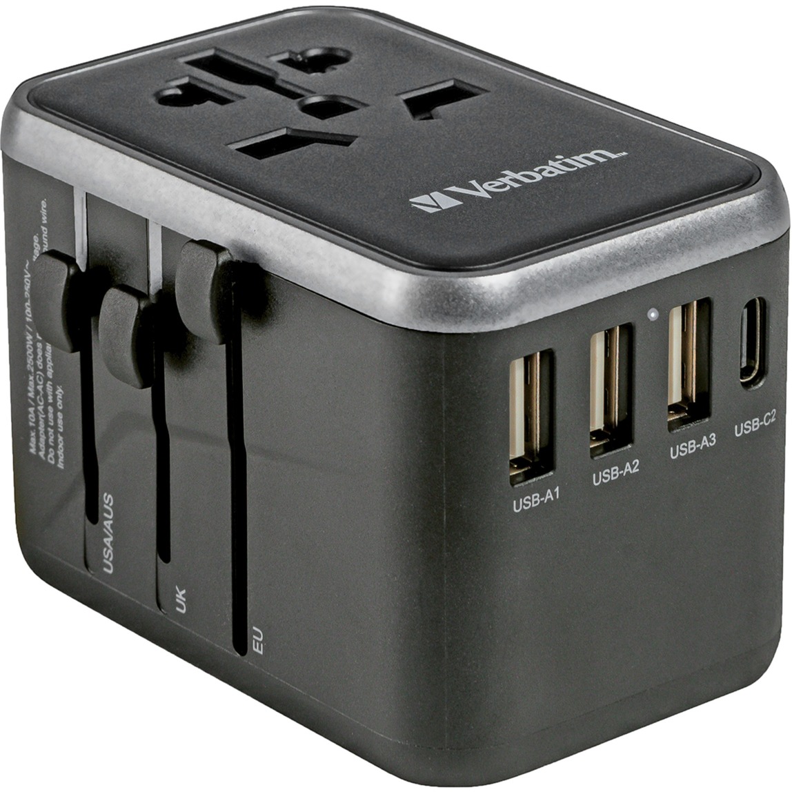 L''adattatore da viaggio universale UTA-04 di Verbatim con cinque porte USB può essere utilizzato in oltre 180 paesi. Grazie al multi-plug World-to-World, dispositivi come laptop o batterie per telecamere possono essere collegati a qualsiasi rete elettrica in qualsiasi parte del mondo e ricaricati. Le cinque porte USB sul fondo possono essere utilizzate per caricare smartphone, altoparlanti Bluetooth, tablet, power bank e lettori di e-book Kindle. Una porta USB-C supporta Power Delivery (PD) 60 watt, un''altra porta USB-C si ricarica con 12 watt, le tre porte USB-A anche con max. 12 watt. L''adattatore da viaggio universale compatto e potente consente di utilizzare contemporaneamente la presa CA e le cinque porte USB. La tensione di ingresso della spina multipla è 100 - 250 volt. Quindi può essere utilizzato in tutto il mondo per caricare più dispositivi. Le tre spine internazionali più comuni (Euro, Regno Unito e Stati Uniti) sono rivelate semplicemente facendo scorrere le manopole e le spine per l''Australia o la Cina sono disponibili semplicemente ruotando i poli. L''adattatore universale UTA-04 è realizzato in policarbonato resistente al fuoco di alta qualità ed è perfetto per l''uso quotidiano durante il viaggio. L''adattatore è dotato di coperture di sicurezza per serrature di sicurezza per bambini e di un fusibile BS 1362 (incluso un fusibile di ricambio). L''adattatore da viaggio è adatto per la maggior parte dei dispositivi elettronici fino a 2.500 W a 250 V e fino a 1.000 W a 100 V.