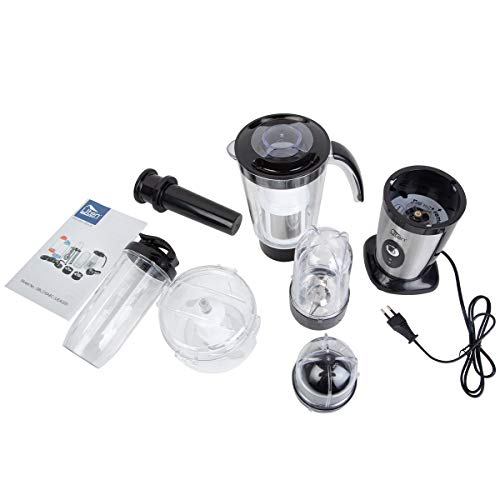 【5 in 1 Multifunzione】5 e 1 frullatore multifunzione, di cui 1 * Coppa Bassa da 300 ml, 1 * Coppa Alta da 500 ml, 1 * Bottiglia da 700 ml, 1 * Tritatutto da 500 ml, 1 * Bollitore da 1250 ml. Include anche 1 * Pestello per Frullatore, 1 * Filtro Bollitore, 1*Lama Piatta, 1*Lama a Croce.