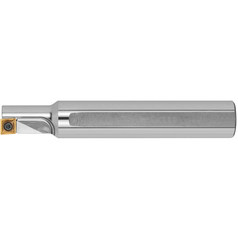 Codolo cilindrico. Uso: 1. Tornitura in piano di superfici frontali. 2. Foratura (allargatura e foratura integrale) − fondo del foro piano. 3. Tornitura longitudinale interna. 4. Tornitura longitudinale esterna. Nota: * Scegliere raggi di testa e dimensioni del supporto più grandi possibili. * Tolleranza del foro +0,15 mm (nei processi di foratura con utensile motorizzato). * In caso di foratura superiore al ⌀ nominale, rimarranno tracce di materiale residuo. * Durante le operazioni di foratura lavorare sempre usando il passaggio interno del lubrorefrigerante (minimo 5 bar). Dati tecnici Tipo di prodotto Barra alesatrice Tipo di impiego destra Passaggio interno per LR sì ⌀ Codolo Ds, mm 12 Inserto adatto ZCMX 05.. Lunghezza utile L1, mm 15 Set di viti per inserti 269028 40 (IP6;
