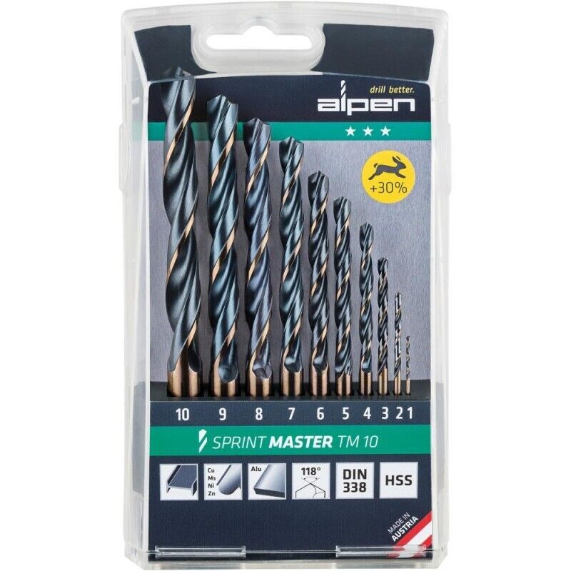 Set di punte Alpen Hss Sprint Sprint Master 10 - Diametri: 1,0 / 2,0 / 3,0 /4,0 / 5,0 / 6,0 / 7,0 / 8,0 / 9,0 / 10,0 mm. - Applicazione: trapano a torsione universaleconalta elasticità. Molto adatto per l'uso in trapani a mano, per la lavorazione di acciai legati e non legati. - Caratteristiche principali: - 30% più veloce. -- - tempo - 3 volte più lungo. - Speciale affilatura, avanza con meno pressione. - con meno pressione. - Blister 3 pezzi. - Il nuovo ALPEN Sprint Master presenta nuove dimensioni de velocità e affidabilità. Grazie alla geometria ottimizzata e alla speciale rettifica della punta ALPEN, il tempo di foratura de si riduce di quasi un terzo. E questo con la consueta eccellenza nella qualità del il risultato. Per darvi una soddisfazione ancora maggiore, il vostro tempo di de utilizzo, che è già considerevolmente più lungo, sarà moltiplicato per tre con l'utilizzo di de acciaio HSS de la più alta qualità e uno speciale trattamento termico. Velocità concon