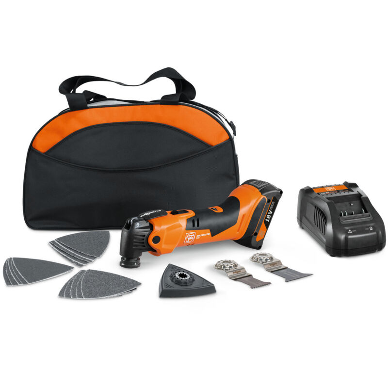 Descrizione del prodotto: Il potente multiutensile a batteria con 18 accessori per segare e levigare. rall con voi e tutto a portata di mano nella pratica borsa in nylon, compresa una batteria da 18 V 2 Ah e un caricabatterie. Grazie al portautensili StarlockPlus, avrete accesso a circa 100 accessori FEIN delle classi di prestazioni Starlock e StarlockPlus. Motore a corrente continua: tecnologia del motore efficace e ad alta coppia per prestazioni quasi identiche a quelle della versione a rete. Dinamo tachimetrica: velocità costante anche sotto carico e regolazione elettronica continua del numero di giri. Scatola ingranaggi in metallo: elevata capacità di carico e massima durata, poiché tutte le parti della scatola ingranaggi sono in metallo. Interfaccia meccanica: per il funzionamento stazionario nel supporto del tavolo o del supporto del trapano o per il fissaggio dell'arresto di profondità. Protezione elettronica delle celle (ECP): ECP protegge la batteria da sovraccarico