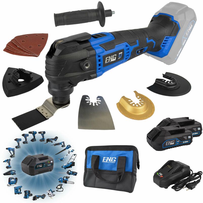 Utensile multifunzione - ENG PRO - 1B20-UMF0-2B2 Caratteristiche tecniche: Alimentazione a batteria ONE4ALL 20V Velocità 5000 - 20000 rpm Regolazioni velocità 6 Angolo di oscillazione 3° Blocco/sblocco rapido Luce LED Velocità 5000 - 20000 rpm Regolazioni velocità 6 Angolo di oscillazione 3° Peso 1550 g Batteria inclusa 2 Batterie 2.0Ah Caricabatteria incluso Si Accessori inclusi: 2 Batterie 2.0 Ah ONE4ALL Caricabatterie 2.4 A per batterie ONE4ALL Borsa porta utensili in tessuto Impugnatura laterale Lama tonda Raschietto Piastra abrasiva Lama a segmenti Tampone abrasivo 6 Carte abrasive Manuale di istruzioni ITA/ENG Entra nel futuro dell'elettroutensileria con l'Utensile Multifunzione ENG PRO, un membro orgoglioso della nostra innovativa Linea ONE4ALL. Questa linea è pensata per chi cerca la massima flessibilità, grazie all'utilizzo di una singola batteria che si adatta a tutti gli elettroutensili ONE4ALL. Potenza e Versatilità Senza Limiti Con una velocità massima di 20.000 rpm e un