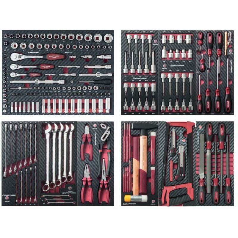 Dettagli: Ampia selezione di utensili da officina, tra cui 236 utensili professionali Incorporati in 10 inserti in schiuma morbida ad alta densità (EVA) rifiniti in carbonio Chiavi combinate da 5,5 a 24 mm Cricchetti reversibili 1/4+3/8+1/2, 45 denti Bussole 1/4 da 3,5 a 14 mm Bussole 3/8 da 8 a 24 mm Bussole 1/2 da 10 a 32 mm