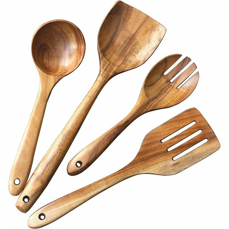 TUTTO QUELLO DI CUI HAI BISOGNO IN UN SET - Un set di utensili da cucina ideale che contiene tutto l'essenziale per cucinare, tra cui spatola per legno, spatola scanalata, mestolo per zuppa, servi per spaghetti. Copre tutte le esigenze della tua cucina, dall'agitazione alla cottura, e con un foro per appenderlo, facile da riporre a parete. E fanno regali fantastici per nuovi proprietari di case o sposi novelli. 【UNICO, SALUTE】 100% fatto a mano in teak tailandese naturale senza rivestimento. Le belle venature e i colori senza macchie possono variare leggermente a causa della costruzione in legno naturale e influenzeranno la temperatura, l'umidità e la secchezza per rendere ogni pezzo unico. E non reagiscono con cibi o bevande e non producono fumi pericolosi. Senza BPA, durevole, ecologico, non tossico! 【SENZA GRAFFI E DUREVOLE】 Realizzato in legno, il nostro set di utensili da cucina è molto liscio e si sente bene, non graffierà né danneggerà le tue pentole preferite! Inoltre non si
