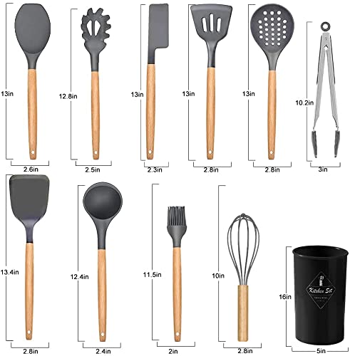 Utensili Cucina Silicone, 33 Pezzi Set Utensili Cucina Silicone Antiaderente, Mestoli Cucina Silicone Senza BPA, Manico in Legno Utensili da Cucina con Supporto - Grigio