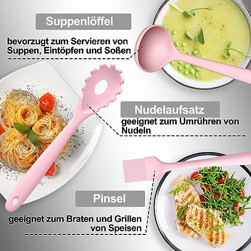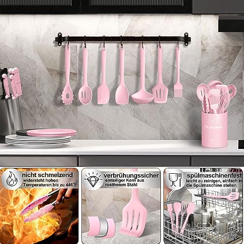 Set di utensili da cucina in silicone, 22 pezzi, utensili da cucina, resistenti al calore, set di posate da cucina con porta utensili, sani e antiaderenti, lavabili in lavastoviglie, colore: rosa