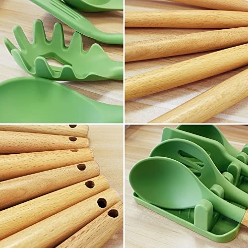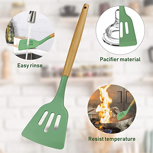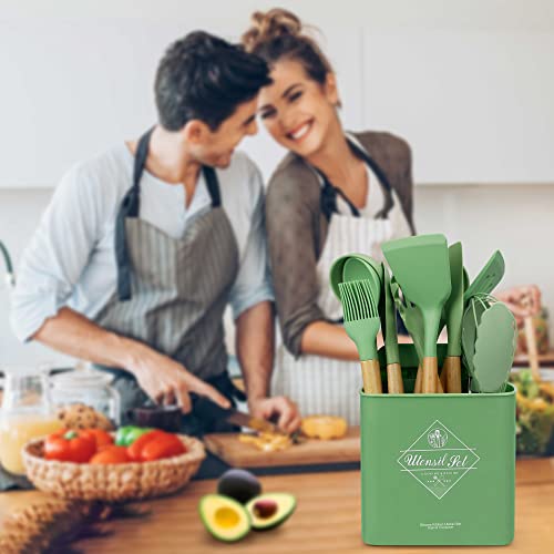 Set di 13 utensili da cucina in silicone resistente al calore, set di spatole da cucina con vassoio, spatola da cucina tornitore resistente al calore con manico in legno (verde avocado)