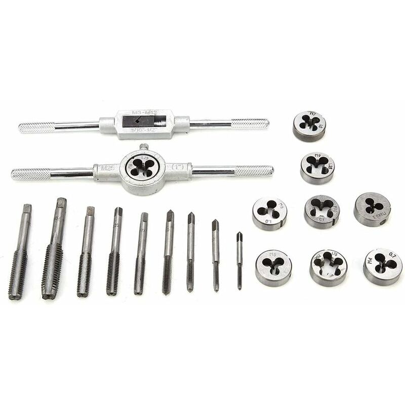 Set di maschi e matrici metriche: questo set di 20 maschi e matrici metriche include 9 maschi e 9 matrici, aiuta a tagliare e pulire le filettature interne ed esterne nelle comuni dimensioni convenzionali da M3 a M12. Il set include anche 1 giramaschi a manico lungo, 1 chiave regolabile, per soddisfare tutte le tue esigenze Strumenti di riparazione filettatura antiscivolo: Estrattori filettatura per riparare filettature. Tocca i dadi di riparazione dell'alesatore, le viti di riparazione dell'alesatore, la superficie del gambo dell'alesatore ha una struttura antiscivolo, l'impugnatura è più forte, la maschiatura è più stabile e può Maschi di serraggio stabili, nessuno sforzo richiesto per una maschiatura di successo. Materiale resistente in acciaio al carbonio: utensile per maschiatura realizzato in acciaio al carbonio di alta qualità, che è stato trattato termicamente e temperato per migliorare la resistenza e la durata. lo strumento di maschiatura ha una buona resistenza agli urti e
