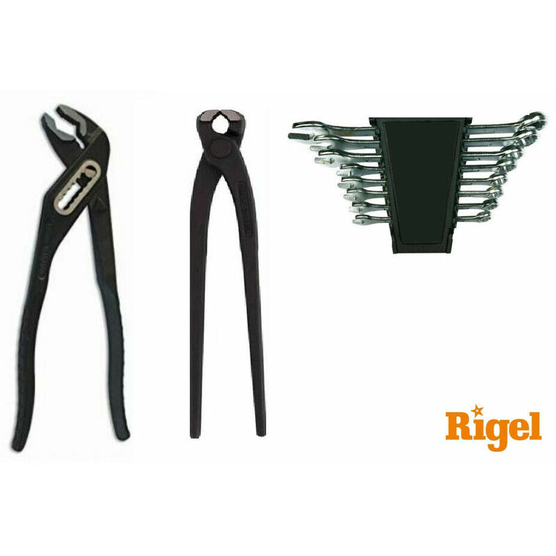 SET 10 UTENSILI 'RIGEL' Set composto da 10 utensili: - n. 1 pinza a pappagallo regolabile di acciaio 250 mm - n. 1 tenaglia di acciaio da cementista - n. 8 chiavi combinate in cromo vanadio ( mm 8,9,10,11,13,14,17,19) Caratteristiche Contenuto: 10 pezzi