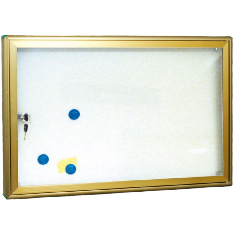 Cornice in alluminio anodizzato. Magneti per fissaggio fogli, serratura a cilindro con 2 chiavi, mm. 600x40x450 h.
